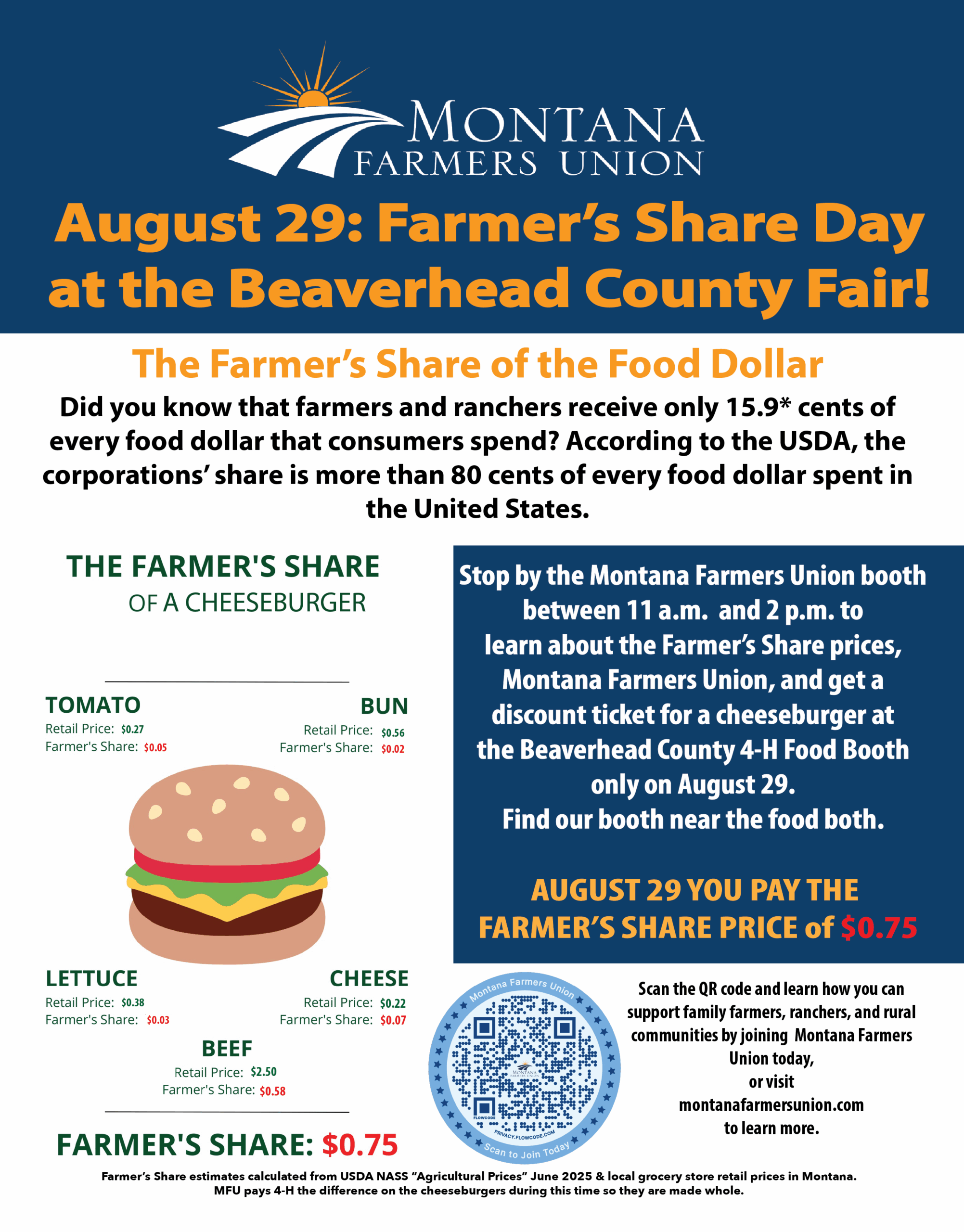 between 11 a.m. and 2 p.m. to learn about the Farmer’s Share prices, Montana Farmers Union, and get a discount ticket for a cheeseburger at the Beaverhead County 4-H Food Booth only on August 29.