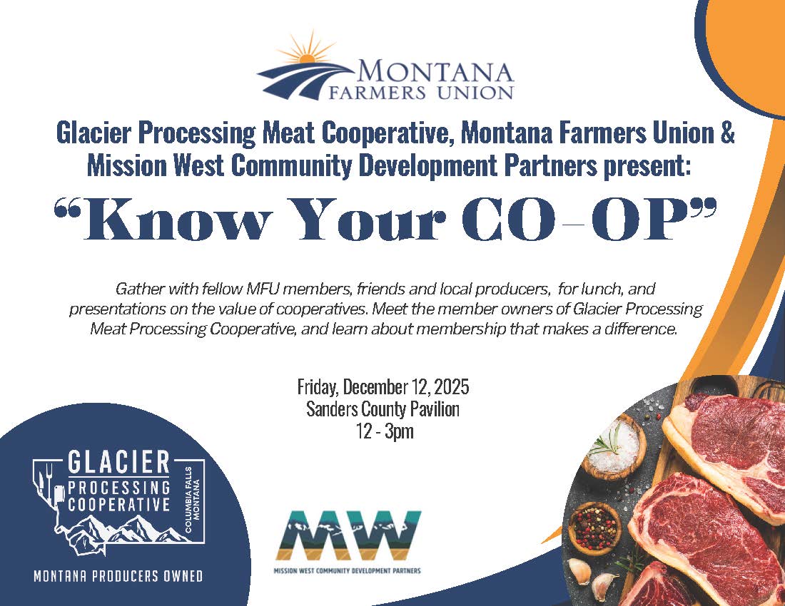 Gather with fellow MFU members, friends and local producers, for lunch, and presentations on the value of cooperatives. Meet the member owners of Glacier Processing Meat Processing Cooperative, and learn about membership that makes a difference.
